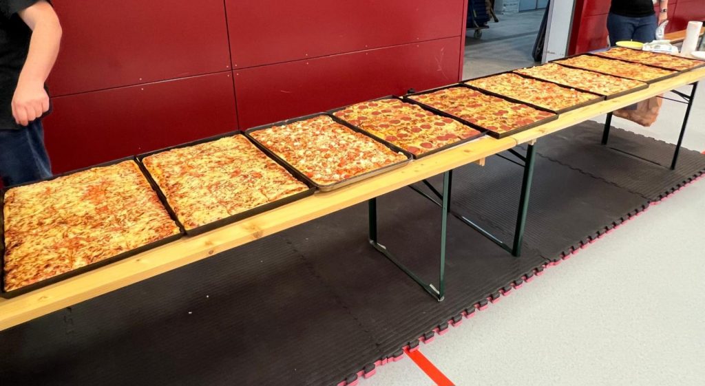 Zur Stärkung gab es am Abend Pizza satt für alle, was nach dem intensiven Training genau das Richtige war. Der krönende Abschluss des Tages folgte in gemütlicher Runde: Wir verwandelten die Pflichthalle kurzerhand in einen Kinosaal und schauten gemeinsam unsere letzte Aufführung „Drei Haselnüsse für Aschenbrödel“.