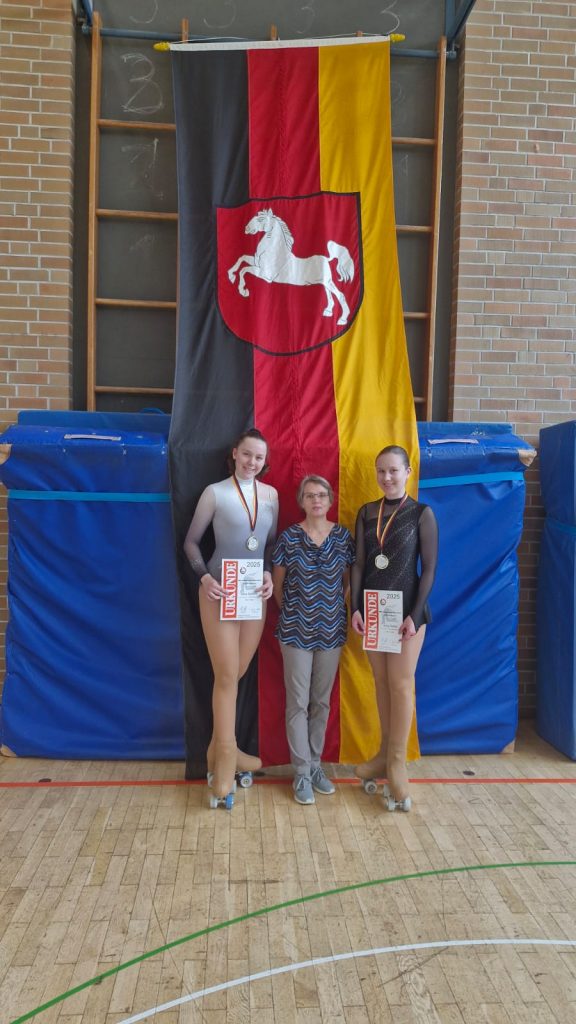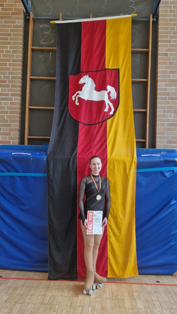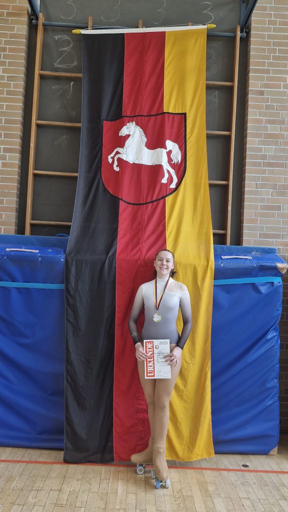 Alina startete in der Gruppe Kunstläufer. Mit sauberen Bögen überzeugte sie die Wertungsrichter und sicherte sich den 1. Platz sowie den Titel „Niedersächsische Breitensportsiegerin Pflicht – Kunstläufer“.